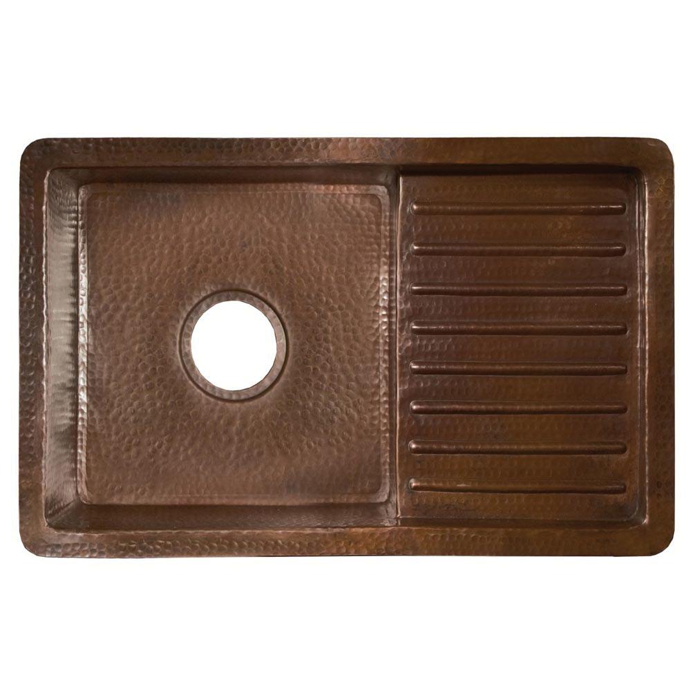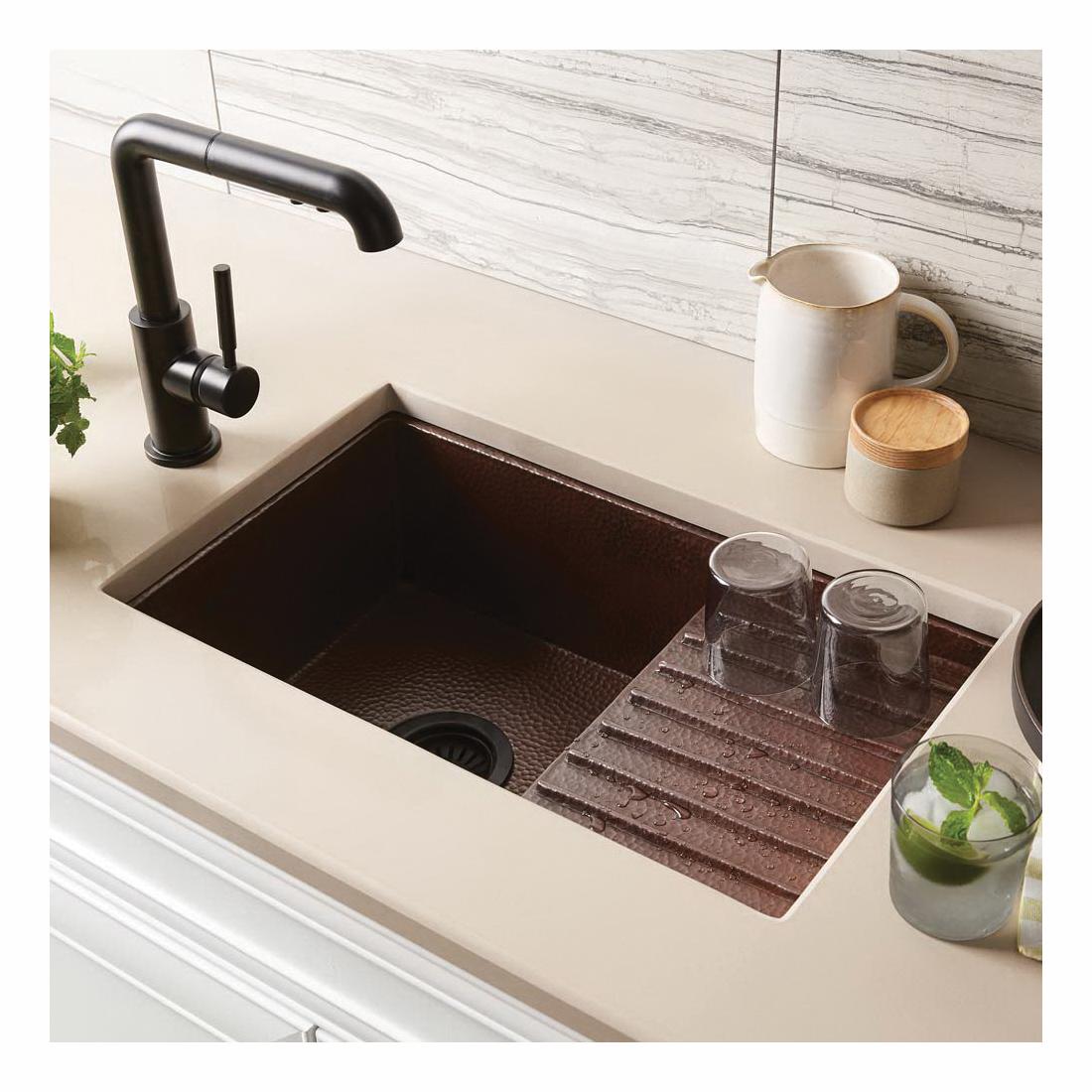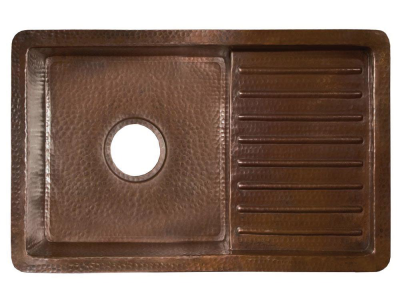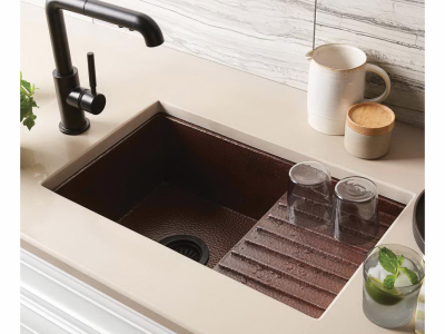 This copper bar Sink embodies an artistic practicality. The graded drain board delivers convenience and showcases a striking, hammered finish, and its streamlined, undermount design allows for easy clean up. Artisan-crafted and forged of high-quality recycled copper, the Cantina Pro brings modern functionality to a classic material.