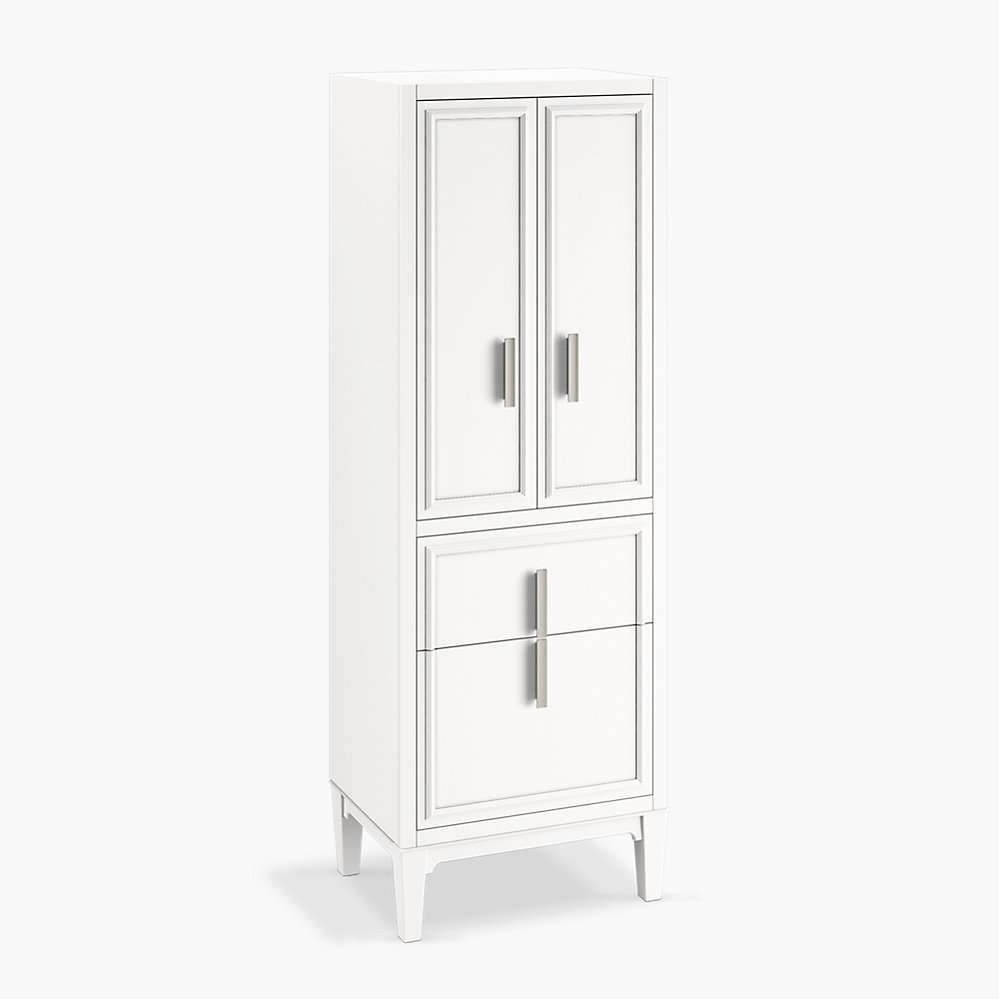 Elegant and mysterious, Southerk bathroom cabinetry evokes contemporary class with a nod to the traditional for an aesthetic that suits any style. Frame-like molding on drawer- and door-front panels tease hidden storage entrances, further adorned with elongated decorative handles that align to form a single design element on stacked drawers. Make your everyday furniture uniquely yours with choice of color. Linen tower, legs, and Vibrant(R) Brushed Nickel hardware are included. Additional hardware finishes are also available.