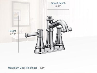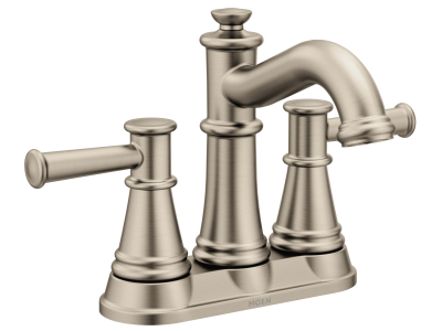 Moen® Centerset Bathroom Faucet, Belfield™, 1.2 gpm, 4 in Center Distance, High-Arc Spout, 4-13/16 in Spout Reach, 6-1/8 in Spout Height, Lever, 2 Handles, Metal Pop-Up Drain, 3 Faucet Holes, 1/2 in, IPS, Spray Pattern: Aerated, 1-3/16 in Maximum Deck Thickness, Deck Mount, 1234 Duralast® Ceramic Disc Valve/Cartridge, 9.63 in W x 4.81 in D x 6.31 in H, Metal, Brushed Nickel, Domestic