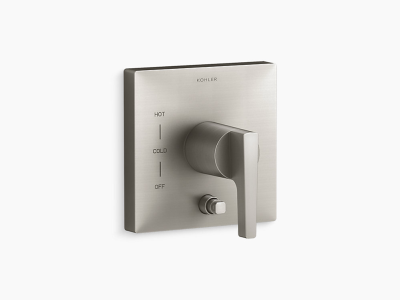 With clean lines and square features, the contemporary Honesty faucet collection draws inspiration from modern European design. This shower valve trim includes a lever handle and diverter button for easy water control. Pair this trim with a Rite-Temp(R) pressure-balancing valve with push-button diverter, which maintains your desired water temperature during pressure fluctuations.