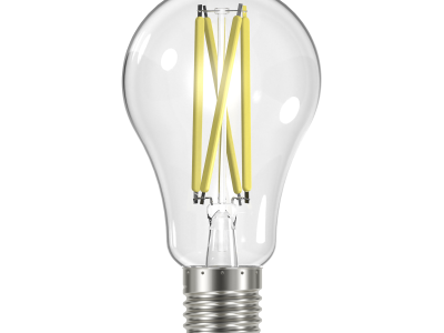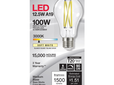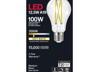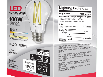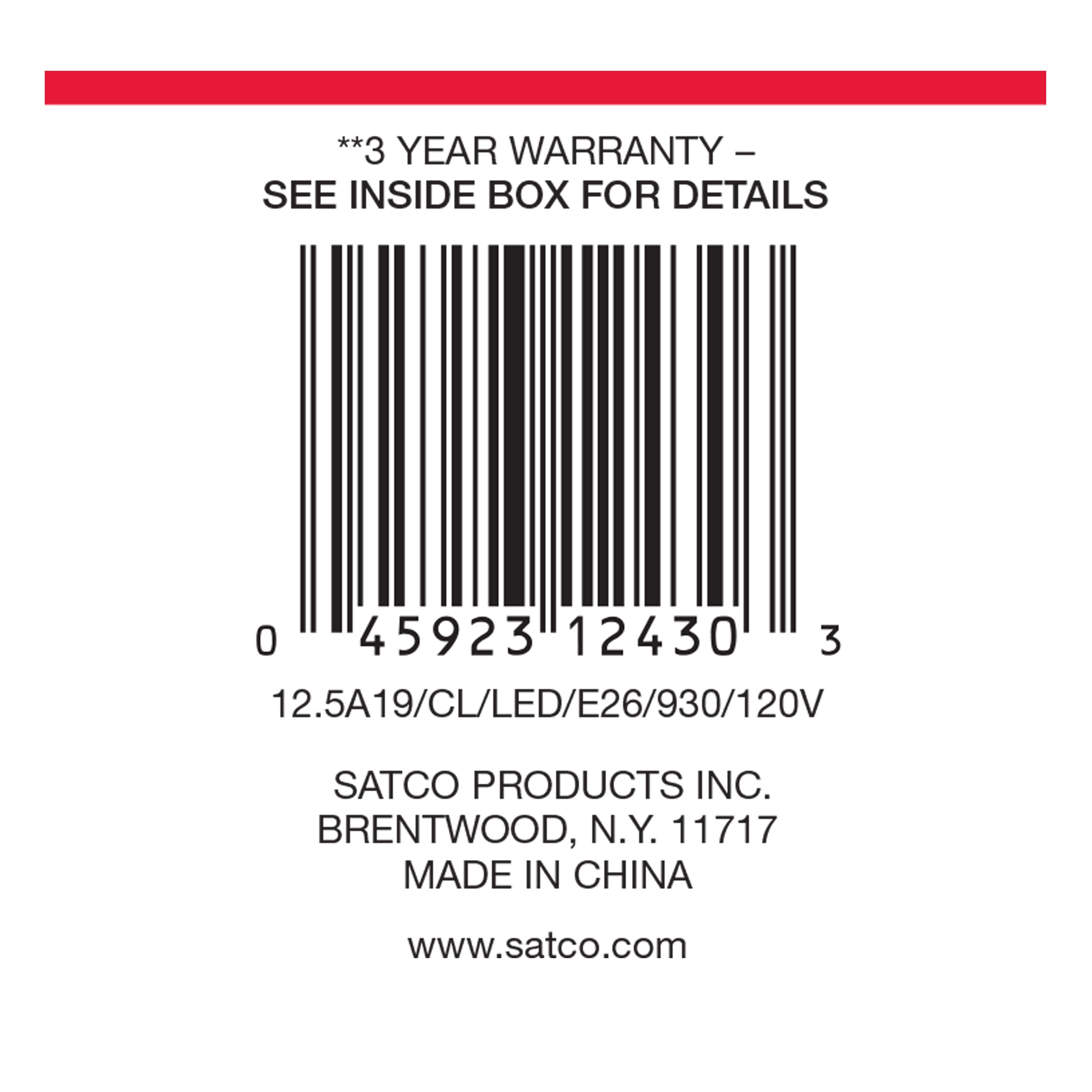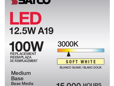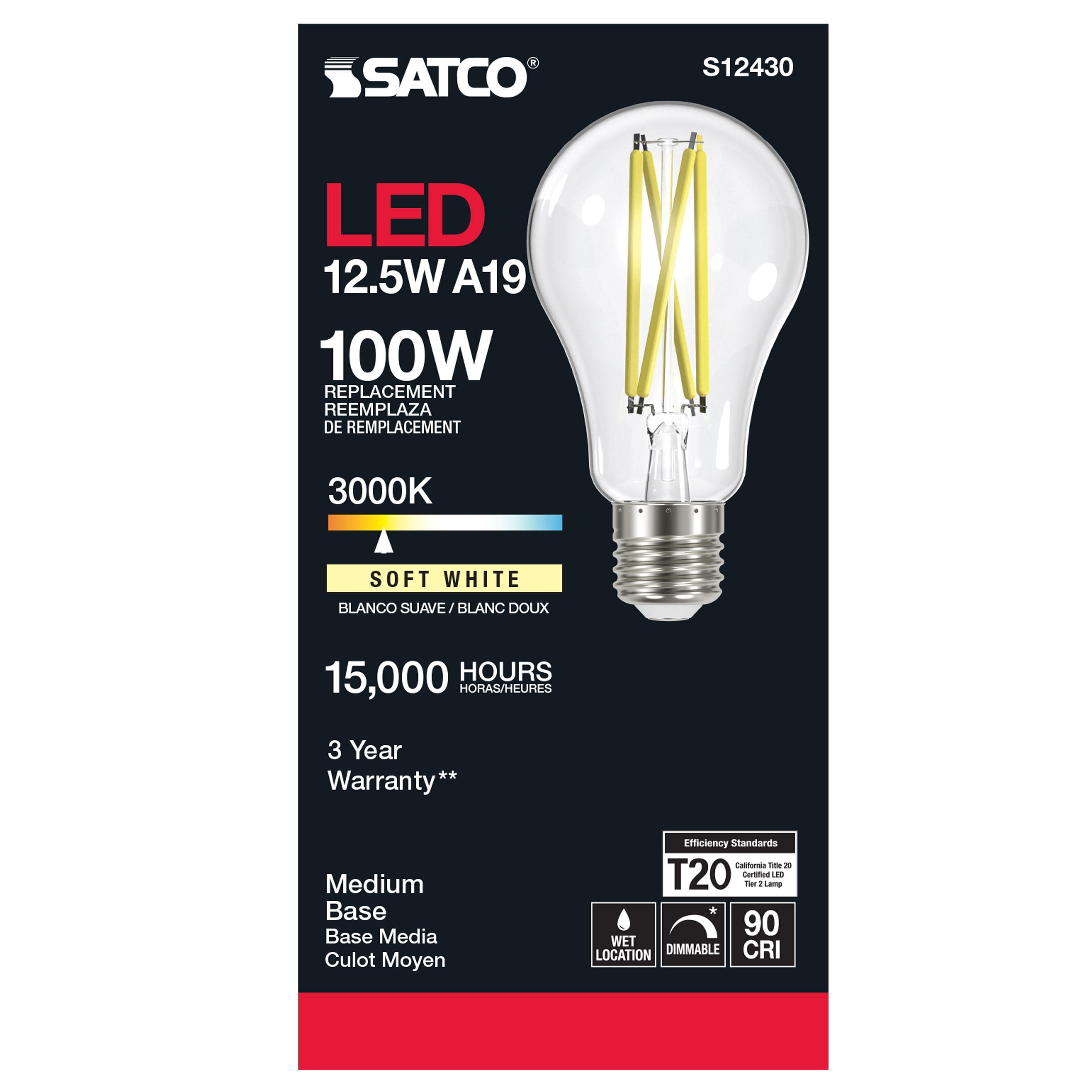 SATCO® LED Lamp, TRIAC Dimmable, 12.5A19/CL/LED/E26/930/120V Designation, 12.5 W Wattage, 100 W Incandescent Equivalent, 120 V, E26 Lamp Base, A19 Shape, 1500 Lumens, 15000 hr Average Life, Soft White, 90 CRI, 3000 K Color Temperature, Clear Lamp, 320 deg Beam, 2.36 in Dia x 4.41 in L Dimensions