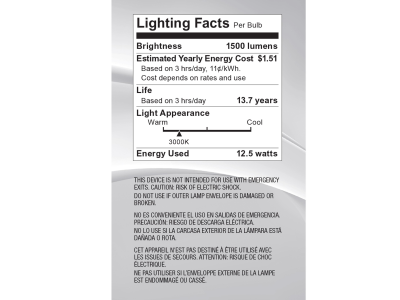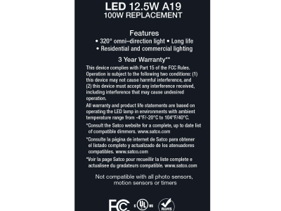 SATCO® S12430 TRIAC Dimmable LED Lamp, 12.5 W, 100 W Incandescent Equivalent, E26 Lamp, A19 Shape, 1500 Lumens