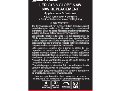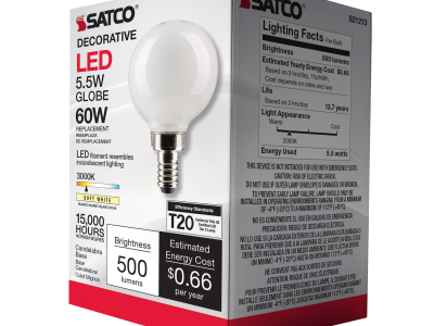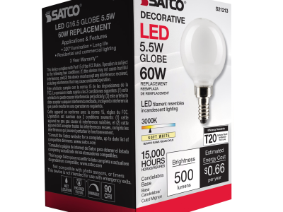 SATCO®, S21213, Light Bulb, Dimmable, 5.5 W Wattage, 60 W Incandescent Equivalent, 120 V, E12 Lamp Base, G16.5 Shape, 500 Lumens, 15000 hr Average Life, Warm White, 90 CRI, 3000 K Color Temperature, 320 deg Beam, 3.11 in L x 1.97 in Dia Dimensions