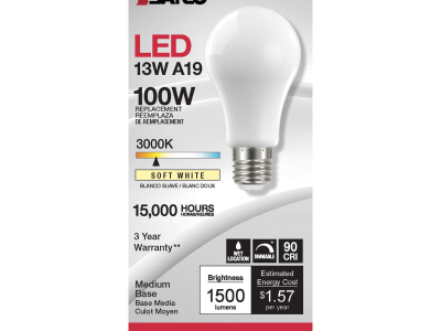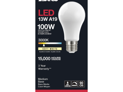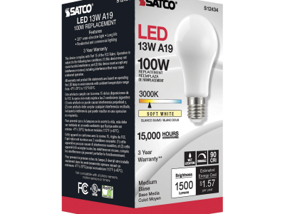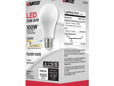 SATCO® LED Lamp, TRIAC Dimmable, 13.5A19/SW/LED/E26/930/120V Designation, 13.5 W Wattage, 100 W Incandescent Equivalent, 120 V, E26 Lamp Base, A19 Shape, 1500 Lumens, 15000 hr Average Life, Soft White, 90 CRI, 3000 K Color Temperature, Soft White Lamp, 320 deg Beam, 2.36 in Dia x 4.41 in L Dimensions