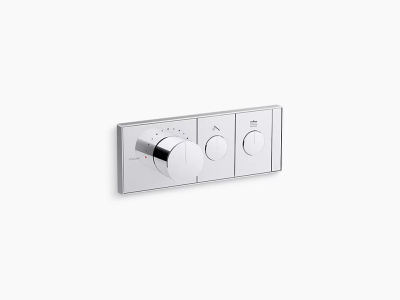 Thermostatic technology allows you to maintain consistent temperature and flow control for the ultimate shower experience. This sleek thermostatic valve control panel with recessed push buttons is designed for use with an Anthem two-port thermostatic valve (K-26340). The trim plate includes a temperature control knob with integrated adjustable high-temperature limit stop as well as shower outlet activation buttons that pop out for the adjustment of water flow (up to 8 gpm).