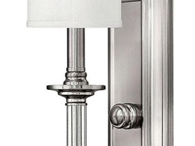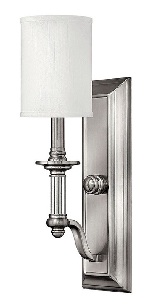 Hinkley®, 4790BN, Single Light Scone, Traditional, Series: Sussex, 120 V AC, 5/60 W Lamp, Candelabra Lamp Base, 1 Lamps, White Fabric Hardback Shade, Wall Mounting, Metal Housing Material, Brushed Nickel Housing Finish, 18 in H x 4.75 in W Dimensions