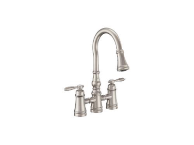 Moen® Pulldown Kitchen Faucet, Series: S73204 Series, Weymouth™ Collection, 1.5 gpm Flow Rate, 360 deg High-Arc Spout, 8-15/16 in Spout Reach, 9-3/16 in Spout Height, 68 in L Hose, Lever/Cross Handle, 2 Handles, 3 Faucet Holes, 1-1/2 in Faucet Hole, 3/8 in Connection, Compression Connection, Spray Pattern: Aerated Stream/Boosted Rinse/Boosted Stream/Powerful Cleaning Rinse, 4 Spray Functions, 2-1/2 in Maximum Deck Thickness, Deck Mounting, 1234™ Duralast™ Cartridge, 16-3/4 in H Dimensions, Metal, Spot Resist™ Stainless, Domestic