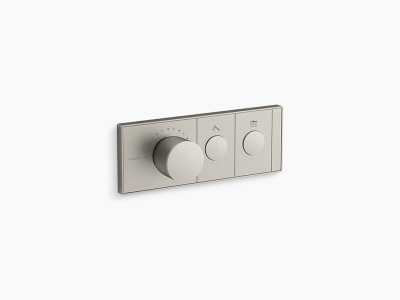 Thermostatic technology allows you to maintain consistent temperature and flow control for the ultimate shower experience. This sleek thermostatic valve control panel with recessed push buttons is designed for use with an Anthem two-port thermostatic valve (K-26340). The trim plate includes a temperature control knob with integrated adjustable high-temperature limit stop as well as shower outlet activation buttons that pop out for the adjustment of water flow (up to 8 gpm).