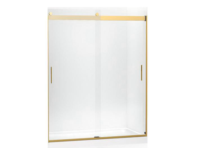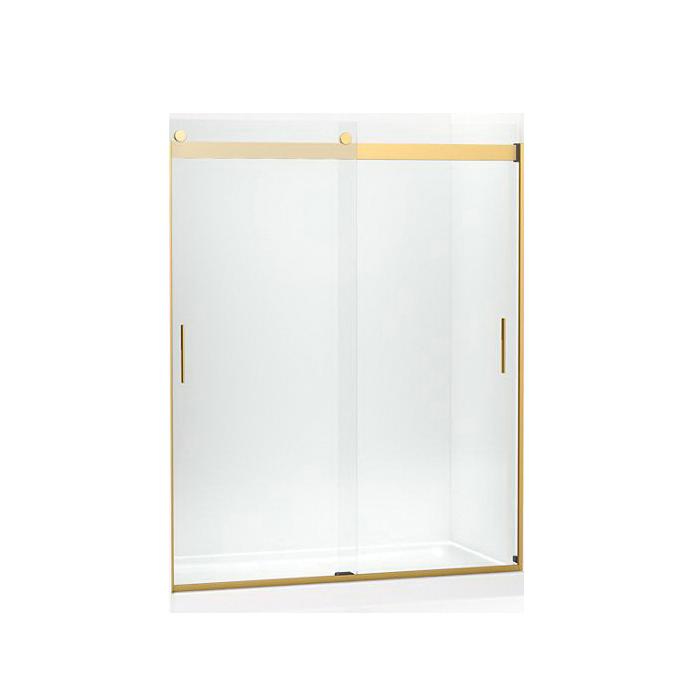Kohler® Sliding Shower Door, Series: 706164-L, Levity™ Collection, 56-5/8 to 59-5/8 in Opening Width, 67 in Opening Height, Frameless Frame, Crystal Clear Glass, 5/16 in Glass Thickness, 74 in Overall Height, 59-5/8 in Overall Width, 24-9/16 to 27-9/16 in Walk Through, Vertical Blade Handle, Anodized Aluminum, Vibrant® Brushed Moderne Brass