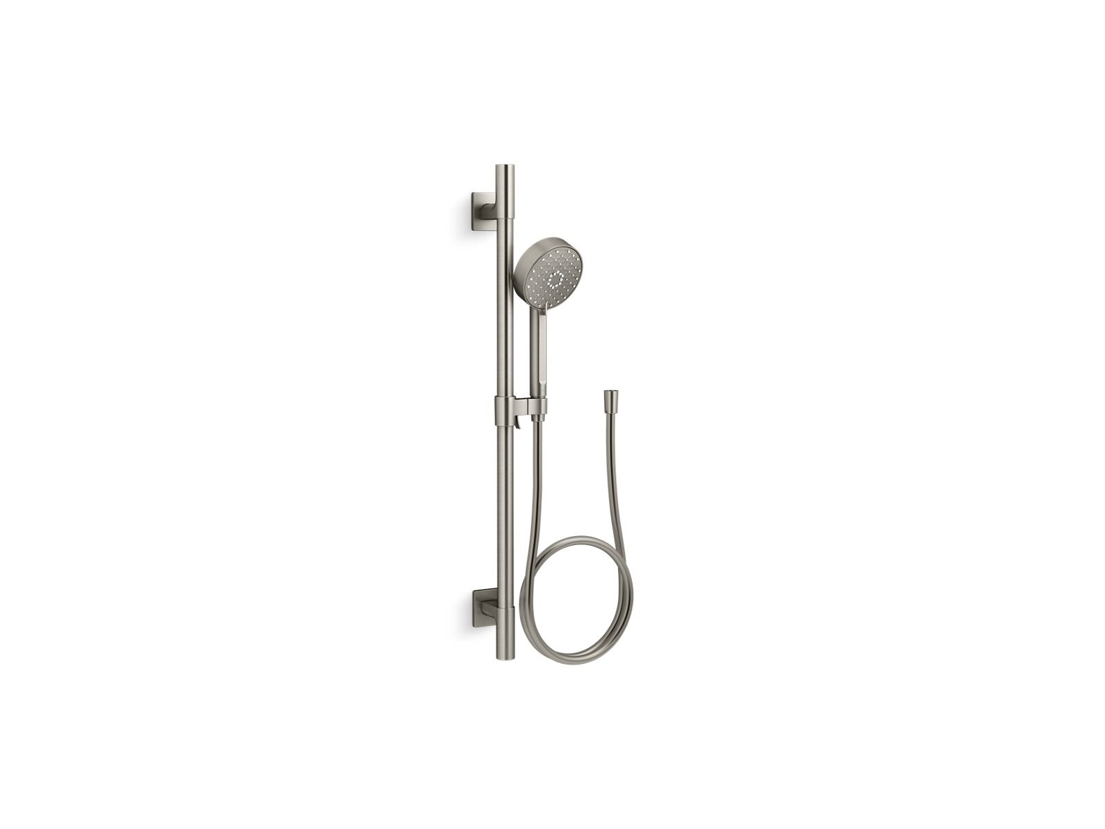 This all-in-one kit includes the KOHLER® Awaken G110 1.75-gpm multifunction wall-mount handshower, a 24" slidebar, and a 60" smooth hose. Advanced spray performance delivers four distinct sprays - wide coverage, intense drenching, targeted massage, or reduced-flow spray - with a smooth rotation of a thumb tab. Ergonomic design makes for superior comfort and ease of use, with ideal balance and weight in the hand. The artfully sculpted sprayface reveals simple, architectural forms that complement contemporary and minimalist baths.