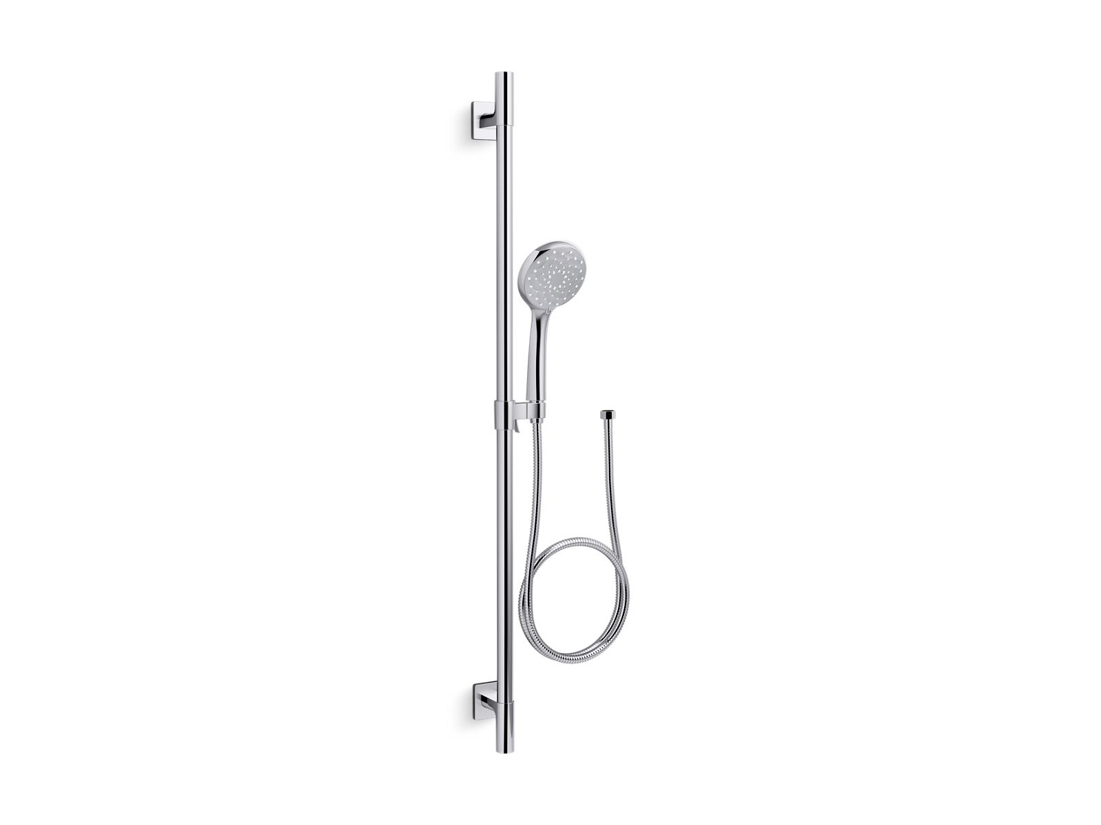 This all-in-one kit includes the KOHLER® Awaken B110 1.75-gpm multifunction wall-mount handshower, a 36" slidebar, and a 60" metal hose. Advanced spray performance delivers four distinct sprays - wide coverage, intense drenching, targeted massage, or reduced-flow spray - with a smooth rotation of a thumb tab. Ergonomic design makes for superior comfort and ease of use, with ideal balance and weight in the hand. The artfully sculpted sprayface takes its inspiration from the purposeful patterns found in nature, complementing a wide range of bathroom styles.