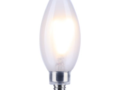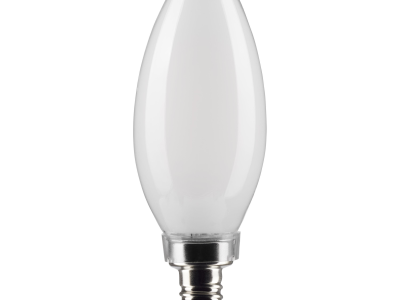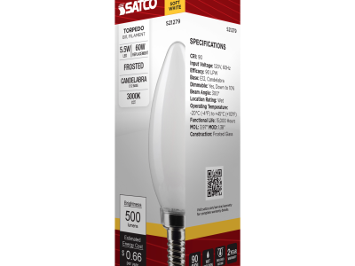 SATCO®, S21279, Bulb, Candle, 5.5 W Wattage, 60 W Incandescent Equivalent, 120 V, E12 Lamp Base, B11 Shape, 500 Lumens, 15000 hr Average Life, Soft White, 90 CRI, 3000 K Color Temperature, Frost Lamp, Dimmable Ballast, Enclosed Fixture, 300 Beam, 1.38 in Dia x 3.97 in L Dimensions