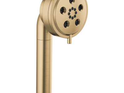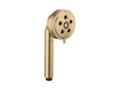 Brizo® Handshower, Linear Universal, ESSENTIAL™ Collection, 1.75 gpm Maximum, 1/2-14 NPSM Connection, Round Shape, 3 Sprays, Spray Pattern: H2Okinetic® Rinsing/Massage/Pause, 80 psi Pressure, 3-7/16 in Head, 3.38 in Overall Length, 3.44 in Overall Width, 8.88 in Overall Height, Plastic, Luxe Gold, Import