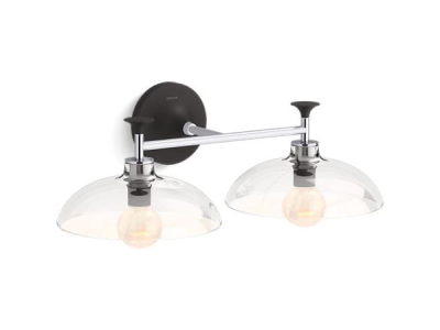 Kohler® Light Sconce, Series: 31769-SC02, 120 V AC, 60 W Lamp, E12 Candelabra Lamp Base, 2 Lamps, Clear Glass Shade, Wall Mounting, Steel Housing Material, Matte Black/Polished Chrome Housing Finish, 20-1/8 in L x 10-3/4 in W x 6-3/4 in H Dimensions