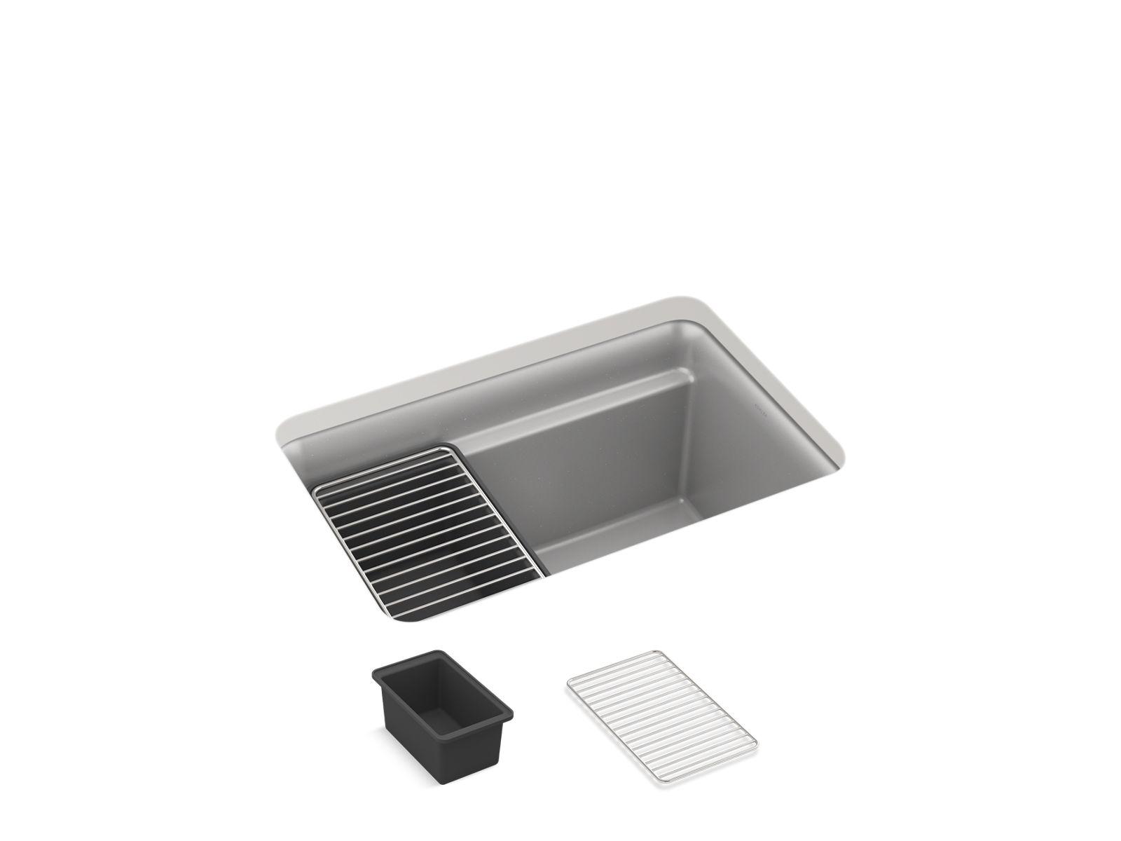 With soft curves, the KOHLER® Cairn undermount utility sink offers transitional style to suit the kitchen and laundry room alike. This undermount kitchen sink's Cairn sink is made of KOHLER® Neoroc®, a matte-finish composite material designed for extreme durability and unmatched beauty. Richly colored to complement any countertop, Neoroc resists scratches, stains, and fading and is highly heat- and impact-resistant. The Cairn utility sink offers an extra-deep bowl that gives you ample room for a variety of cleaning tasks. Included with the sink are a convenient deep wash bin and stainless steel utility rack that slide effortlessly within the sink to tailor your workstation for the task at hand.