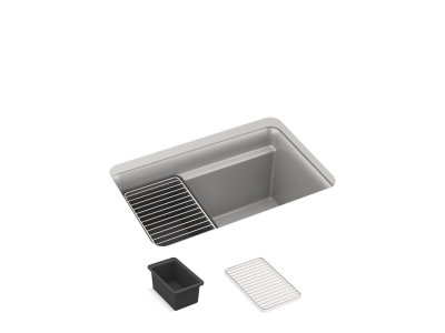 Kohler®, 27787-CM4, Kitchen Sink, Offset Drain, Series: 27787, Cairn® Collection, Rectangular Shape, 24-3/8 in Bowl Length, 15-3/8 in Bowl Width, 12 in Bowl Depth, 3-7/8 in Drain Opening, 0 Faucet Holes, 1 Bowls, 12-5/8 in H x 18-5/16 in W x 27-1/2 in L Overall, Undermount Mounting, Neoroc Composite, Matte Grey