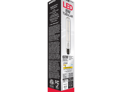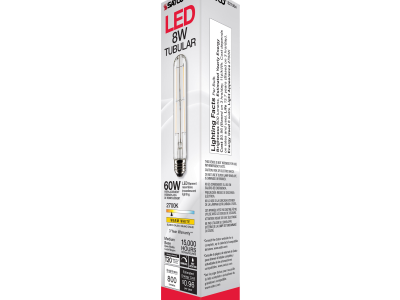 SATCO®, S21354, Bulb, 8 W Wattage, 60 W Incandescent Equivalent, 120 V, E26 Lamp Base, T9 Shape, 800 Lumens, 15000 hr Average Life, Warm White, 90 CRI, 2700 K Color Temperature, Clear Lamp, Dimmable Ballast, Enclosed Fixture, 1.18 in Dia x 7.20 in L Dimensions