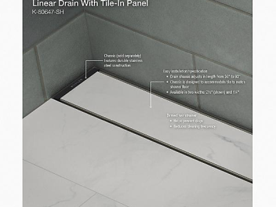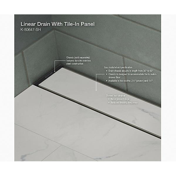 Incorporate this KOHLER® easy-to-install, linear shower drain grate into your next contemporary shower project for an elegant, minimalist look with maximum function. This innovative drain solution delivers the best-in-class quality you’ve come to expect from KOHLER®, including lightweight, durable, easily trimmable drain channel inserts featuring precision-machined grate patterns and anodized scratch-resistant finishes. Available in different patterns, finishes, and sizes to complete your custom home or commercial shower installation.
