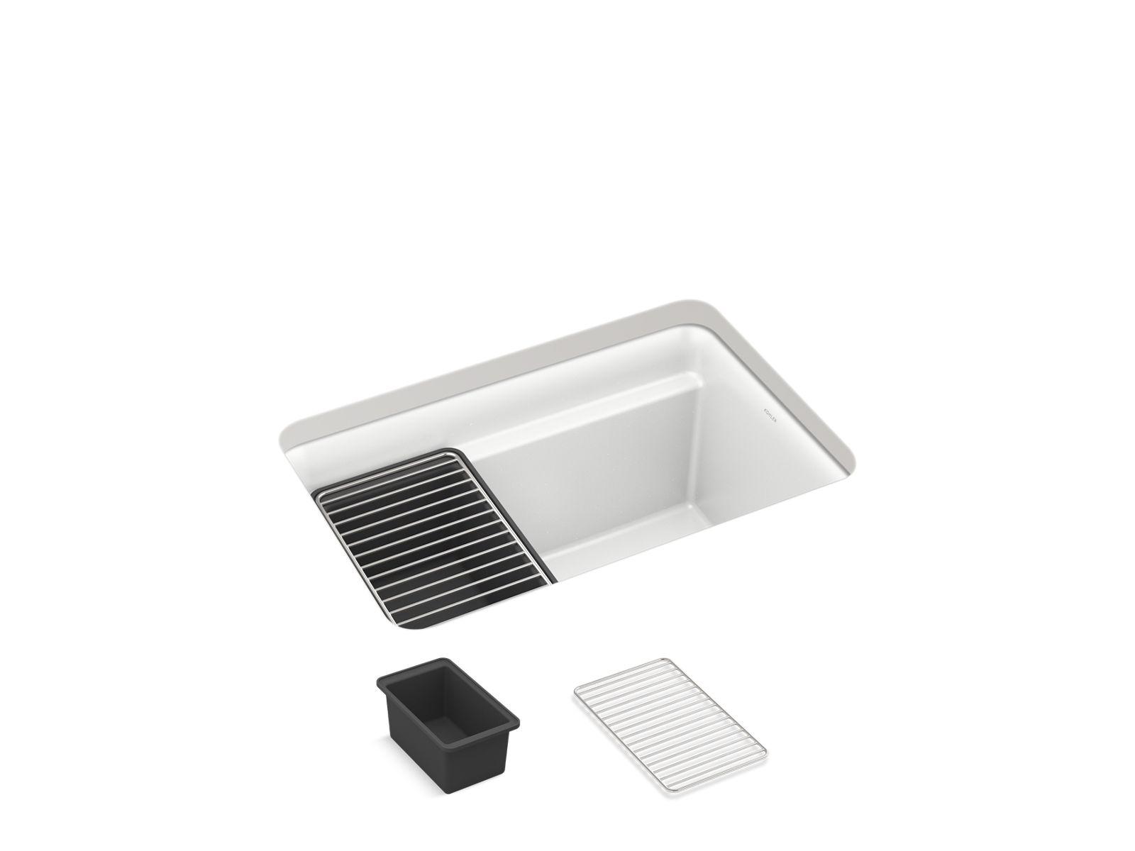 Kohler®, 27787-CM6, Kitchen Sink, Offset Drain, Series: 27787, Cairn® Collection, Rectangular Shape, 24-3/8 in Bowl Length, 15-3/8 in Bowl Width, 12 in Bowl Depth, 3-7/8 in Drain Opening, 0 Faucet Holes, 1 Bowls, 12-5/8 in H x 18-5/16 in W x 27-1/2 in L Overall, Undermount Mounting, Neoroc Composite, Matte White