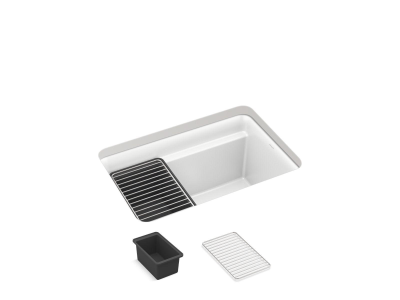 With soft curves, the KOHLER® Cairn undermount utility sink offers transitional style to suit the kitchen and laundry room alike. This undermount kitchen sink's Cairn sink is made of KOHLER® Neoroc®, a matte-finish composite material designed for extreme durability and unmatched beauty. Richly colored to complement any countertop, Neoroc resists scratches, stains, and fading and is highly heat- and impact-resistant. The Cairn utility sink offers an extra-deep bowl that gives you ample room for a variety of cleaning tasks. Included with the sink are a convenient deep wash bin and stainless steel utility rack that slide effortlessly within the sink to tailor your workstation for the task at hand.