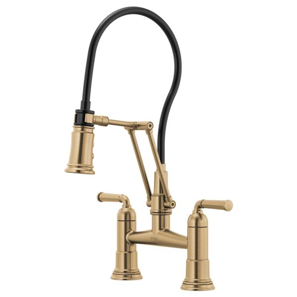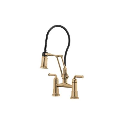 Brizo® Articulating Bridge Faucet, Lead Free, Rook® Collection, 1.8 gpm Flow Rate, 8 in Center Distance, 360 deg Swivel Spout, 6-1/2 in Spout Reach, Lever Handle, 2 Handles, Side Spray(Y/N): Yes, 3 Faucet Holes, 1-1/4 to 1-1/2 in Faucet Hole, 1/2-14 Connection, Female NPSM Connection, Spray Pattern: Spray/Stream, 2 Spray Functions, 3 in Maximum Deck Thickness, Deck Mounting, Ceramic Cartridge, 8.5 in L x 2 in W x 19.38 in H Dimensions, Solid Brass, Luxe Gold, Domestic, Commercial