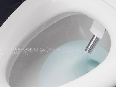 - Bowl is automatically misted prior to use for more effective rinsing while flushing
