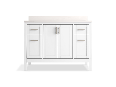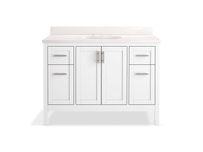 In typical Shaker style, the KOHLER® Hadron bathroom vanity set is a classic. This modest, clean design doesn’t overpower your bathroom — it blends into it — lending itself to many decorating styles. The Hadron 48" freestanding single sink vanity set includes cabinet, quartz countertop, sink, and Vibrant® Brushed Nickel hardware. Pair with any KOHLER® widespread bathroom sink faucet for your own unique touch.