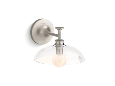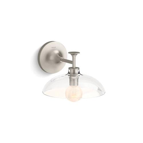 Kohler® Light Sconce, Series: 31768-SC01, 120 V AC, 60 W Lamp, E12 Candelabra Lamp Base, 1 Lamp, Clear Glass Shade, Wall Mounting, Steel Housing Material, Brushed Nickel Housing Finish, 9-1/16 in Dia x 10-3/4 in W x 6-11/16 in H Dimensions