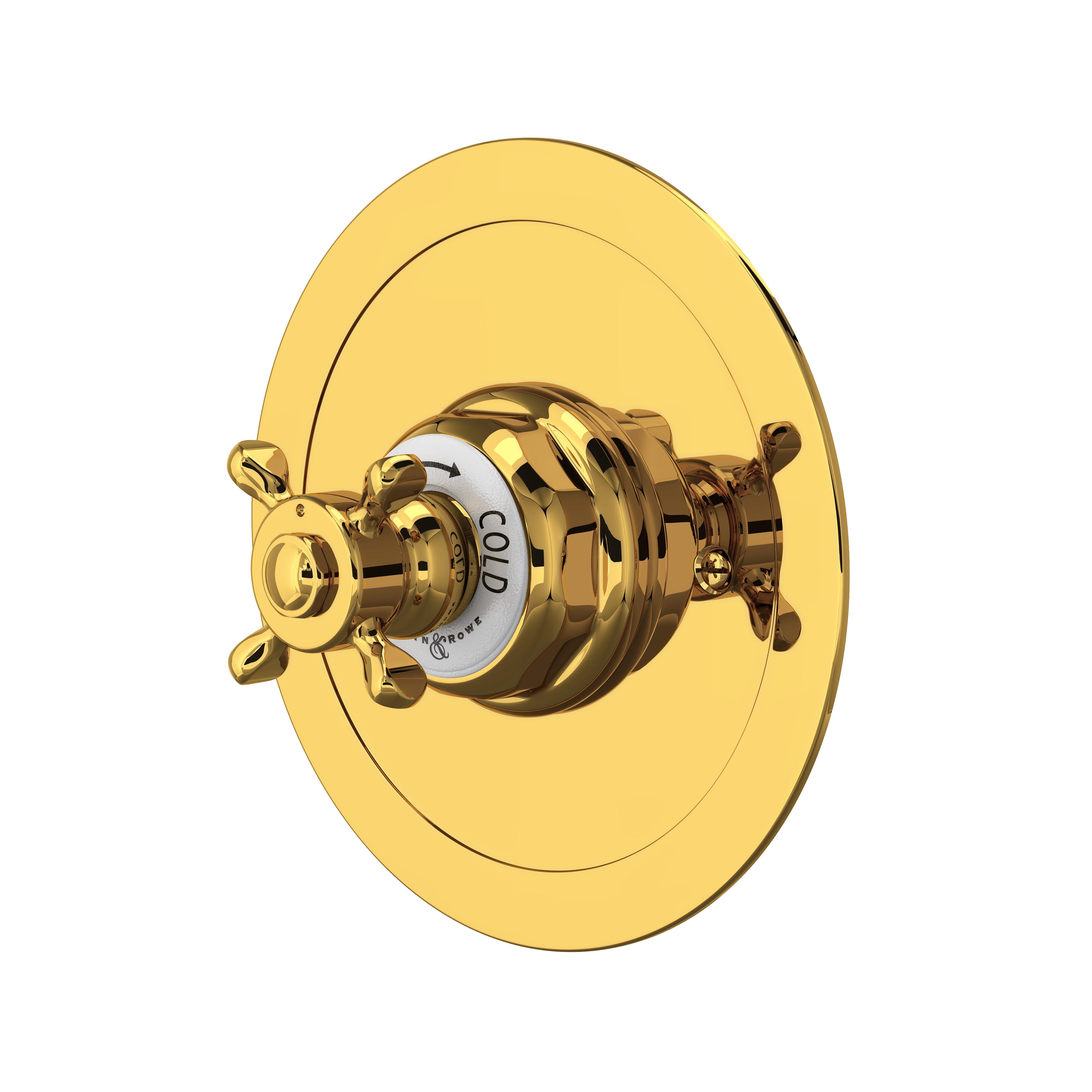 Perrin & Rowe, U.5566X-ULB/TO, Thermostatic Shower, Traditional Round, Edwardian Collection, 1 Faucet Holes, Cross Handle, Wall Mounting, For Use With: U.5585BO Concealed Thermostatic Valve, Unlacquered Brass, 27.94 in W x 19.05 in H x 17.78 in D Dimensions