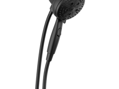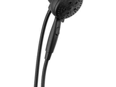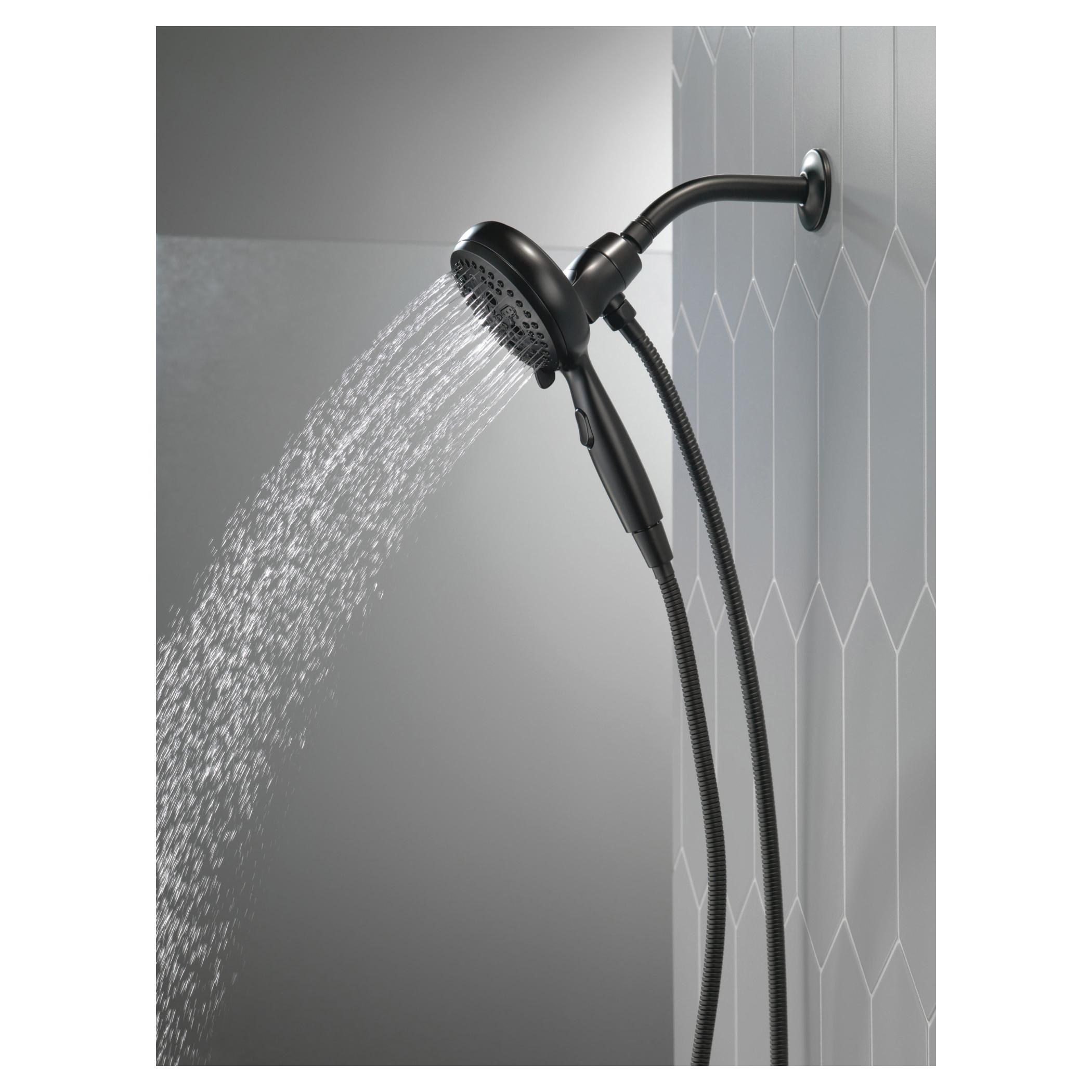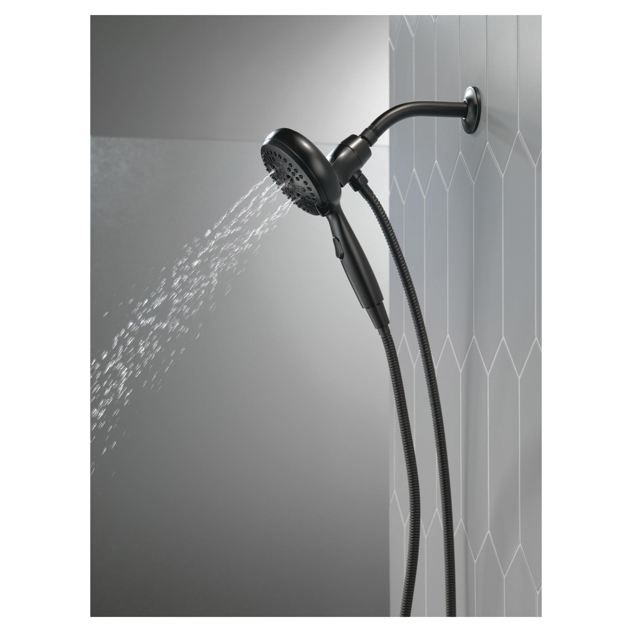 DELTA® Handshower, Universal, 4-7/8 in Shower Head Diameter, 7-Function Shower Head Patterns, 1.75 gpm Flow Rate, 60 to 82 in Hose Length, H2Okinetic® PowerDrench®/Full Body/Full with Massage/Massage/Shampoo Rinsing/Shampoo Rinsing with Massage/Pause Spray, SureDock™ Integrated Holder, 80 psi Pressure, Metal Hose, ABS, Matte Black, 2.19 in L x 4.94 in W x 10.5 in H Dimensions, With Slide Bar: No, Import
