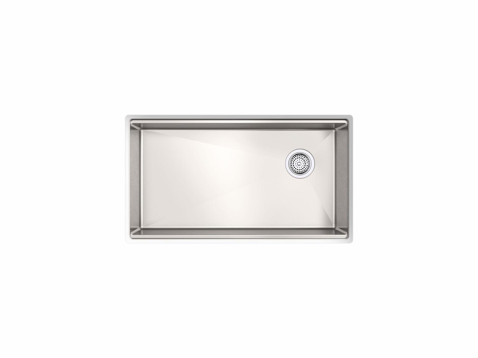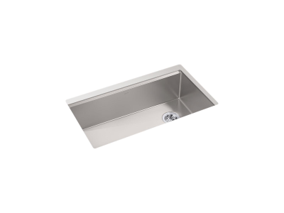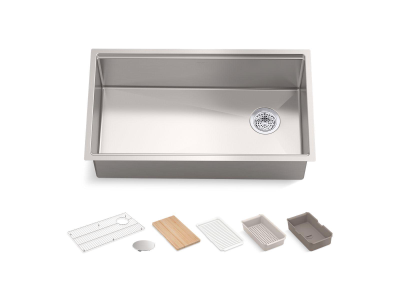 The KOHLER(R) Strive 32" undermount workstation kitchen sink raises the bar on functionality and professional styling with custom accessories that integrate seamlessly within the built-in bowl ledge. With an eye towards food preparation as well as cleanup and storage, the included accessories are both thoughtful and practical. Strive is made of thick, premium quality 16-gauge stainless steel with easy-to-clean rounded corners, and a sound-absorption system that significantly reduces disposal and dishwashing noise. Its large, deep single bowl allows you to soak and clean large cookware and bakeware.