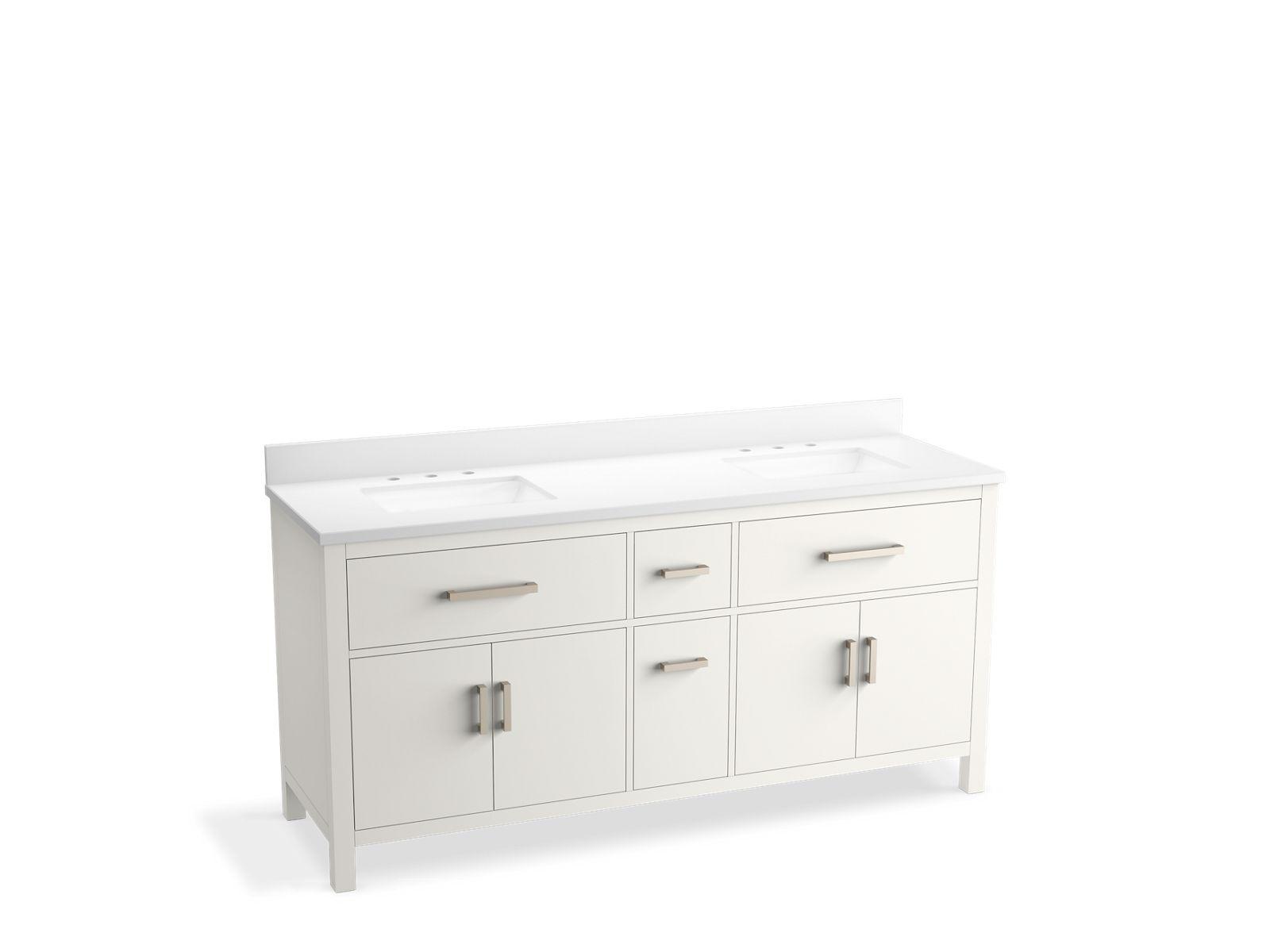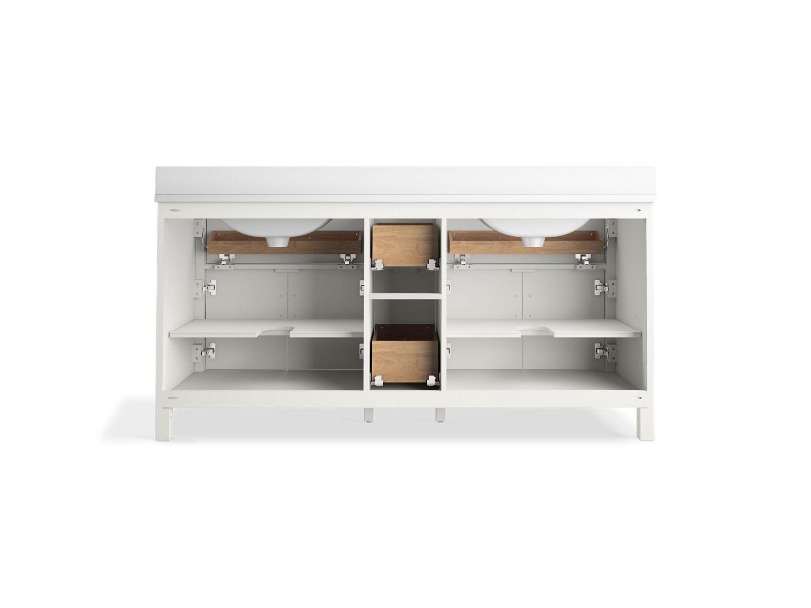 The KOHLER® Kresla vanity collection brings a quiet sophistication into your bathroom space with its with clean, architectural lines and range of finishes, and with its roomy interior, you'll find ample storage space to keep your bathroom organized and clutter-free. The Kresla 72" freestanding double sink vanity set includes cabinet, quartz countertop with matching backsplash, two sinks, and hardware. With KOHLER®, it’s easy to find the design solution that’s right for you.