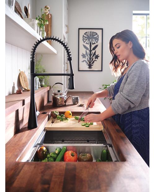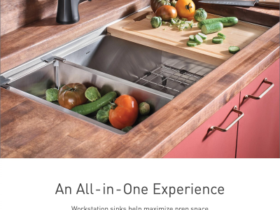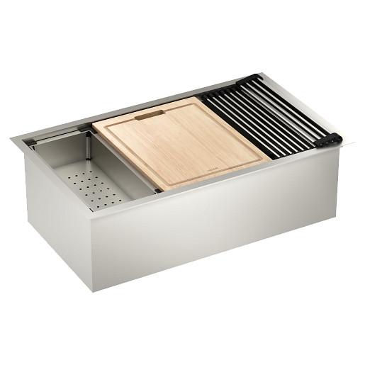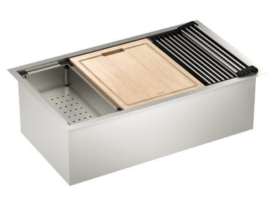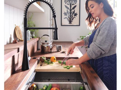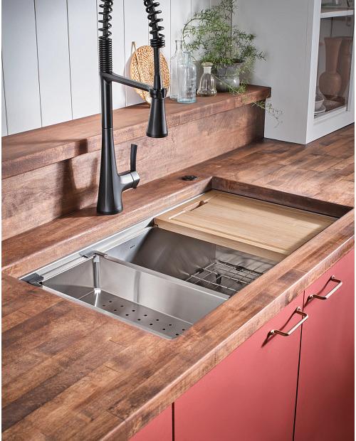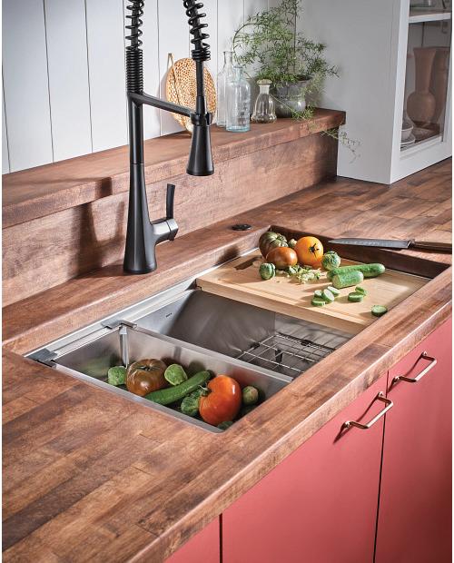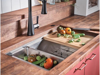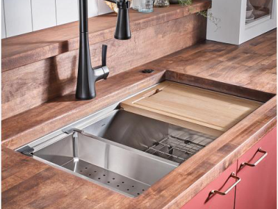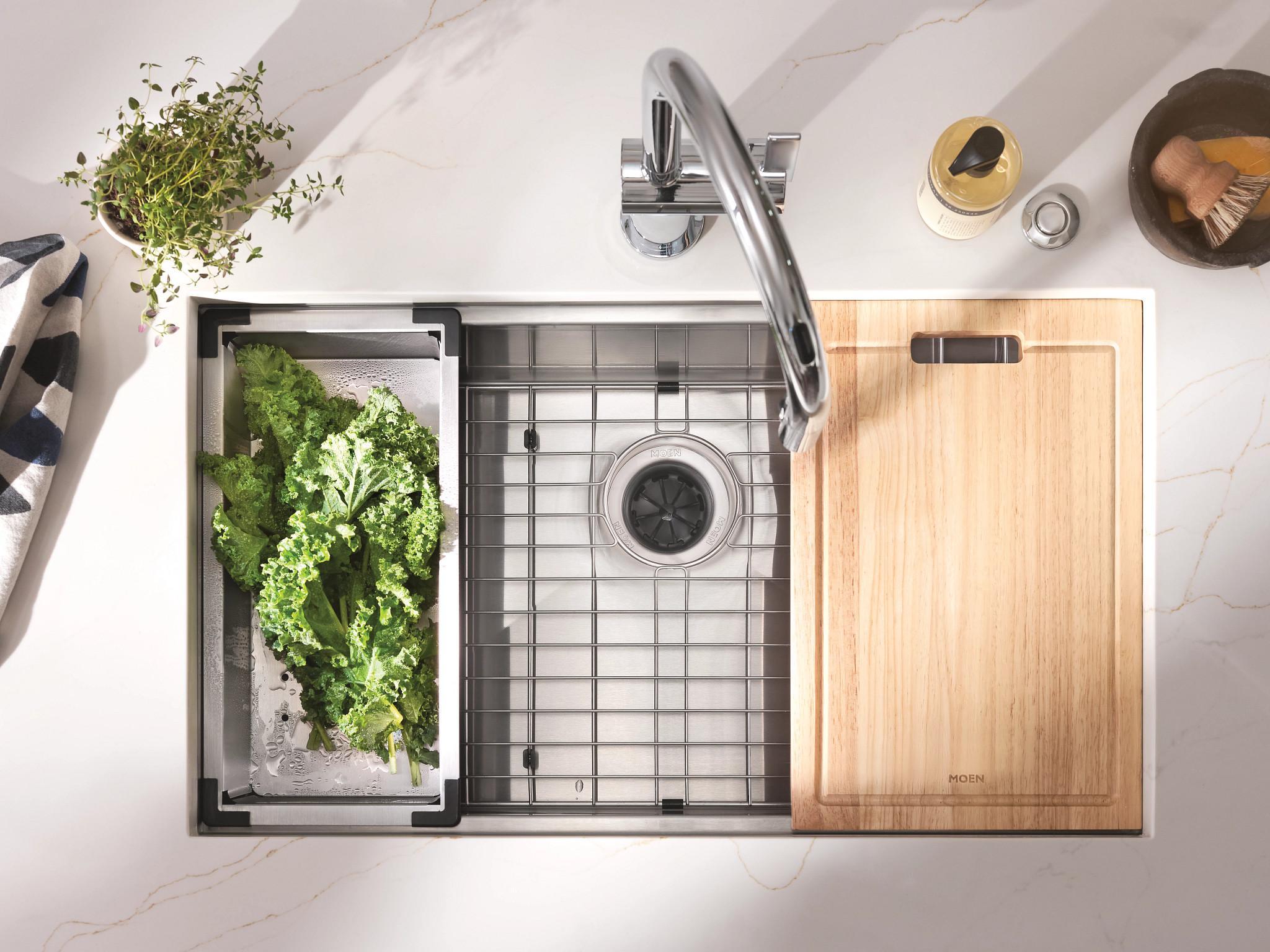 The sink is the heart of the kitchen, and Moen is making it more efficient to move about the space with the new workstation kitchen sinks. With a workstation sink, you can transform messy routines such as rinsing, chopping, and washing into a contained, all-in-one experience right over the sink and free up valuable counter space. The workstation bundle includes a contemporary stainless-steel undermount sink and high-quality accessories such as a bottom sink grid, colander, hardwood cutting board, flexible drying rack, and drain strainer/cover. The sink also includes a built-in ledge to secure accessories or slide them over to tailor your workstation to meet your needs.