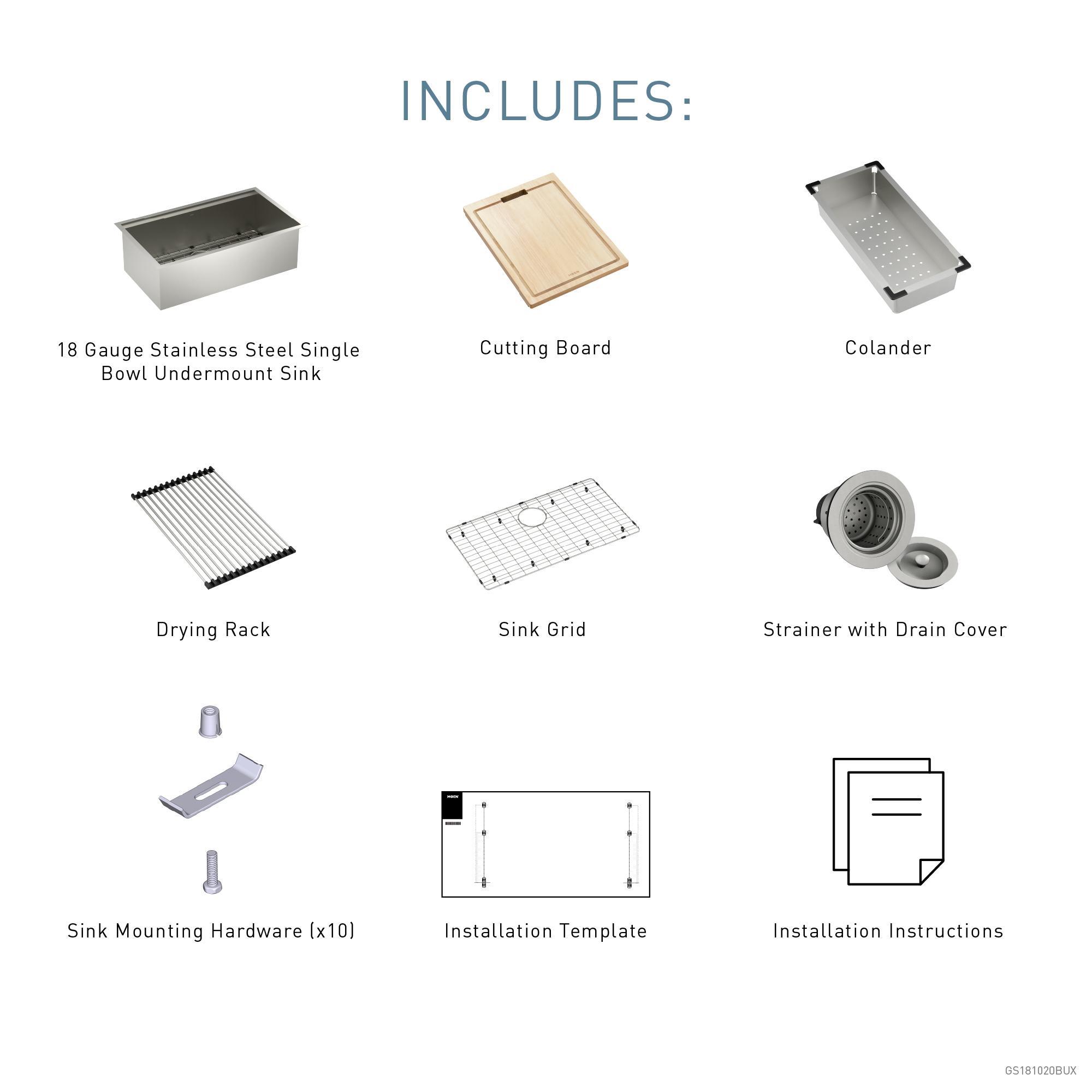 Moen®, GS181020BUX, Kitchen Sink, Rear Center Drain, Series: 1800, 30 in Bowl Length, 15-13/16 in Bowl Width, 3-5/8 in Drain Opening, 1 Bowls, 32 in L x 19 in W Overall, Undermount Mounting, 18 ga Stainless Steel, Brushed Stainless Steel, Import