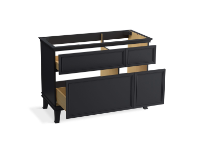Elegant minimalist design meets midcentury traditional influence and Kohler craftsmanship in the KOHLER® Artifacts bathroom vanity. This simply ornamented, all-drawer cabinet features cornice molding reminiscent of an American Federal-style bookcase while flared solid-wood legs inspired by early nineteenth-century linen presses elevate the 48" freestanding double sink vanity’s style and off-floor functionality. Customize your bathroom centerpiece with a coordinating quartz top, contrasting industrial-style drawer pulls, and organizational in-drawer accessories (sold separately) for a look that fits your aesthetic and space.
