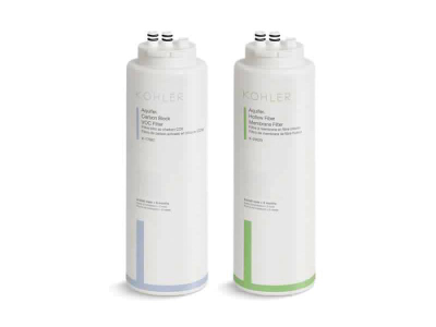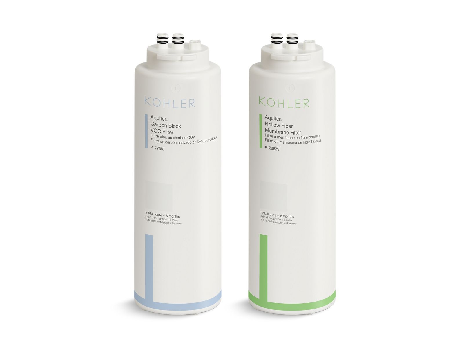 At Kohler, we design our products to give you the right mix of functionality and style to bring comfort to your daily routines. Feel confident with every sip that you are getting nothing but the best for you and your family. Keep your KOHLER® Aquifer water filtration system flowing with this two-pack of replacement filter cartridges. The Aquifer®+ water filtration system uses two filters to effectively reduce harmful chemicals and contaminants including bacteria, virus, lead, mercury, chlorine and pharmaceuticals in your cold water.