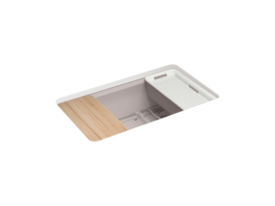 A refined balance of style and function, KOHLER® introduces the Riverby undermount workstation kitchen sink, designed to elevate daily kitchen tasks. This single-bowl sink provides generous space for soaking and washing large cookware, while its sloped base and offset drain help prevent water from pooling. Constructed from enameled cast iron, Riverby resists chipping, cracking, and burning, ensuring lasting beauty and performance. The integrated workstation includes a maple cutting board, dishwasher-safe drain board, colander/drying rack, soaking bin with drain, and a stainless steel bottom rack for enhanced versatility.