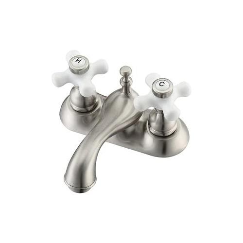 Flawlessly complete your bathroom sink with the timeless and classic Donata Centerset Lavatory Faucet from Barclay. Featuring an elegant brushed nickel finish and attractive porcelain cross handles, this faucet is sure to please. Choose this faucet and discover for yourself the quality, style and difference of Barclay.