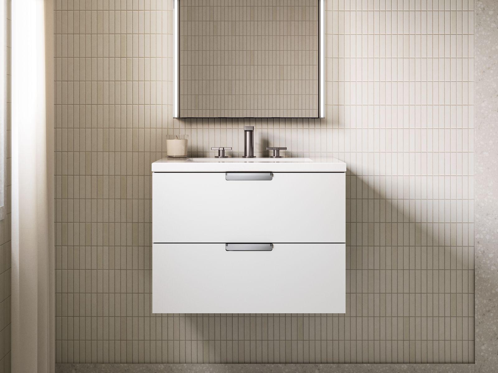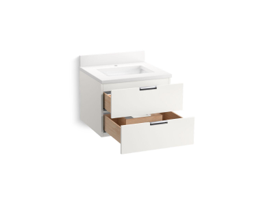 Innovate your bathroom space with the KOHLER® Maxstow 24" wall-hung bathroom vanity set. Comprising a cabinet with hardware, sink, vanity top, and backsplash, the Maxstow 24" wall-mount single sink vanity set is designed to maximize your storage. Full-extension drawers provide ample storage for all of your personal care items.
