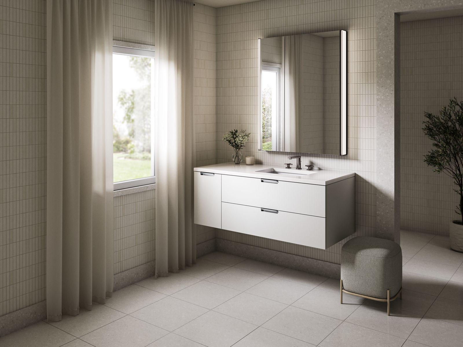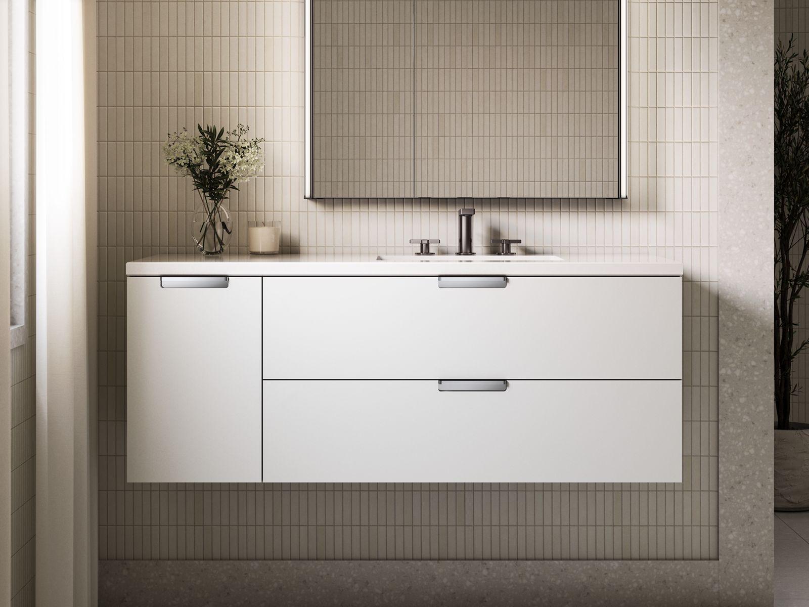 Innovate your bathroom space with the KOHLER® Maxstow 48" wall-hung bathroom vanity set. Comprising a cabinet with hardware, sink, vanity top, and backsplash, the Maxstow 48" wall-mount double sink vanity set is designed to maximize your storage. Full-extension drawers provide ample storage for all of your personal care items.