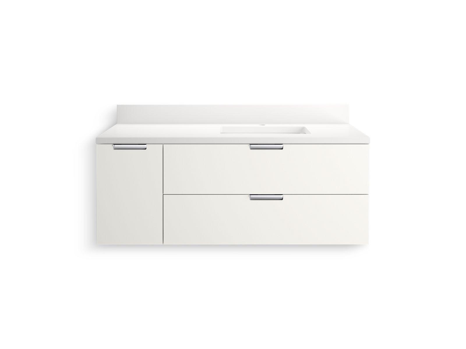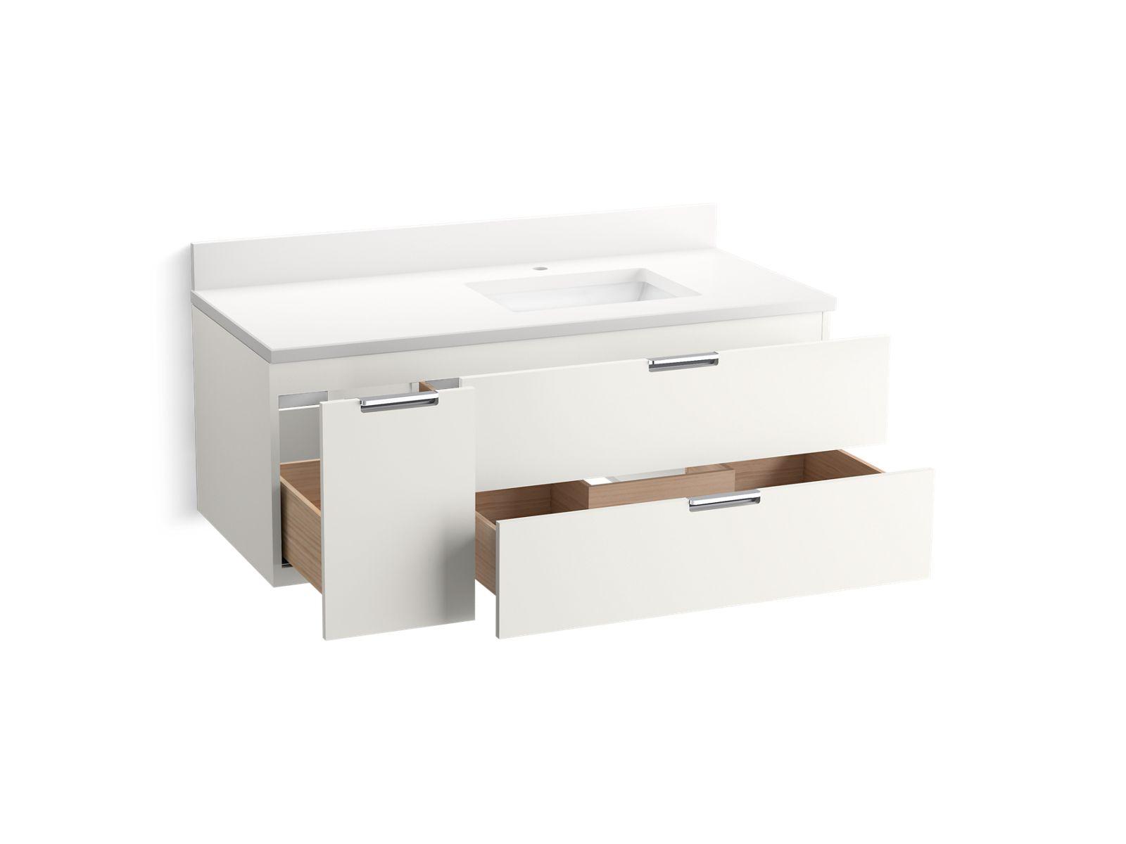 Kohler®, 34656-0, Bathroom Vanity Cabinet, Contemporary, Series: 34656, Maxstow™ Collection, 23-3/8 in Overall Height, 49 in Overall Width, 22-7/16 in Overall Depth, Wall Mounting, 49 in W x 22-7/16 in D Top, Wood Cabinet, White Cabinet, Vitreous China Basin, 2 Doors, 2 Drawers, 1 Basins, 3 Shelves, Quartz Top, 3 Faucet Holes