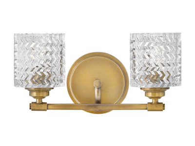 Hinkley®, 5042HB, Vanity Light, Traditional, Series: Elle, 120 V, 14/100 W Lamp, Medium Lamp Base, 2 Lamps, Clear Chevron Glass Shade, Up/Down Mounting, Steel Housing Material, Heritage Brass Housing Finish, 7.5 in H x 14.5 in W x 6.5 in L Dimensions