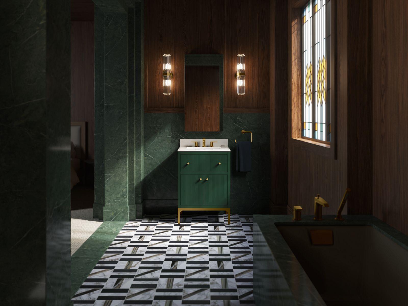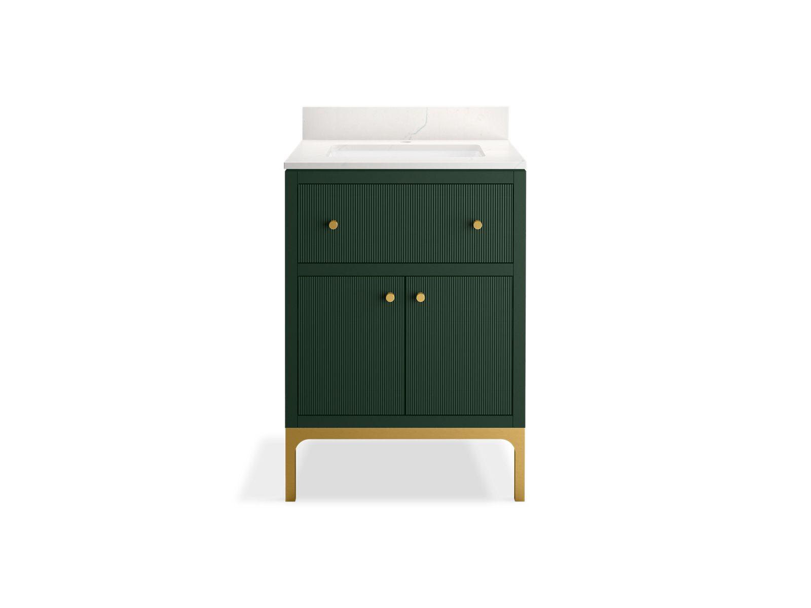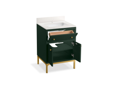Kohler®, 33000-EMG, Bathroom Vanity Cabinet, Contemporary, Series: 33000, Calpa™ Collection, 39-3/16 in Overall Height, 25 in Overall Width, 23-5/16 in Overall Depth, Floor Mounting, 25 in W x 22-7/16 in D Top, Wood Cabinet, Emerald Green Cabinet, Vitreous China Basin, 2 Doors, 1 Drawers, 1 Basins, 1 Shelves, Quartz Top, 1 Faucet Holes