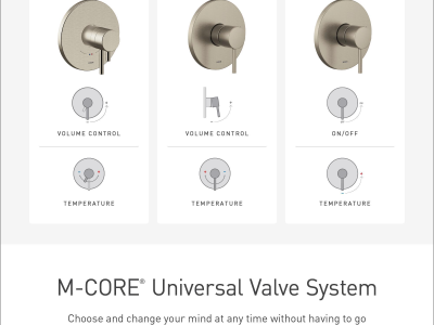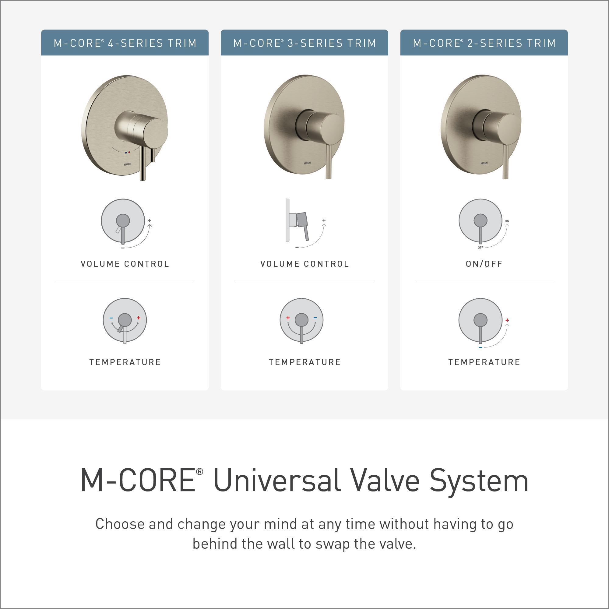 M-CORE is shower design on your time. This universal valve system is simpler and faster to install, and offers additional functionality with desired style choices to create an ideal shower environment. Moen has conducted extensive research to create M-CORE, and what drives the design is a passion to make the workday more streamlined for plumbers, and to give more freedom in showering functionality and design for both new construction and remodel projects. Homeowners and designers will enjoy M-CORE's improved style and finish options, including perfectly matching mixing and transfer trim, and refined details that provide the finishing touches to a dream bathroom. Once installed, M-CORE valves, with 4-Series trim, have thermostatic temperature control functionality which will allow the end user to preset the perfect water temperature, and never have to worry about the temperature of the water ever again. 4-Series reacts to temperature changes and will continuously make slight adjustments to ensure the water maintains perfect temperature. 4-Series also provides volume control functionality that allows the end user to adjust the flow volume of water, without impacting water temperature.